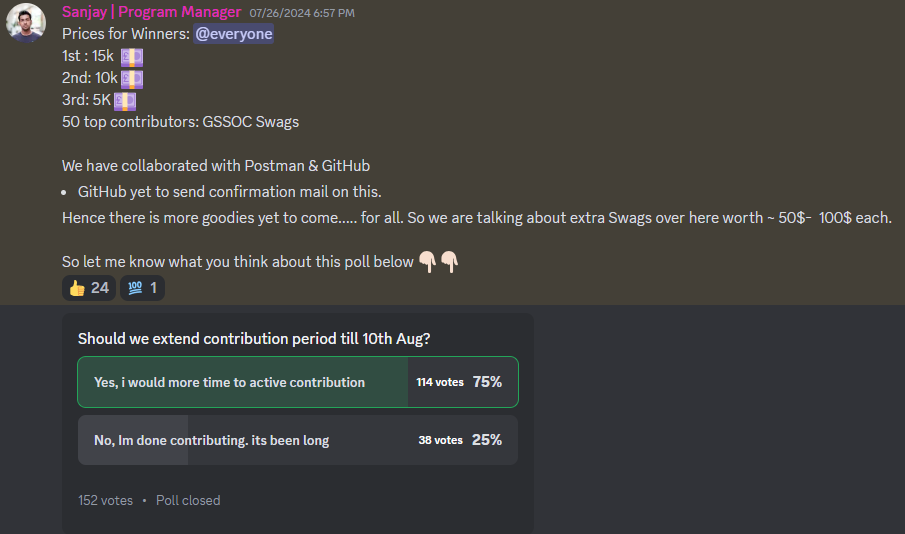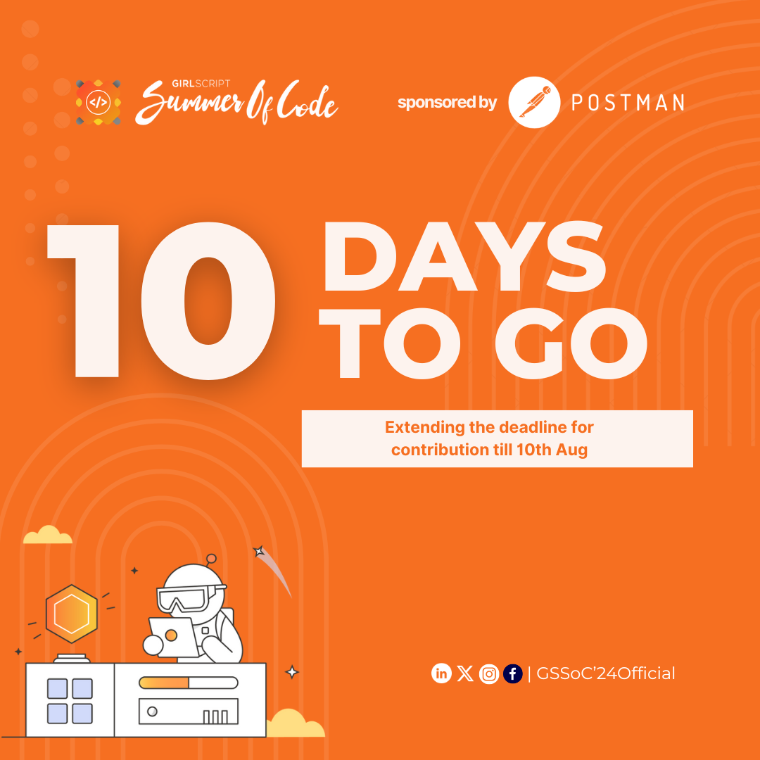 We are excited to share some fantastic news! Due to overwhelming interest on postman and to give more contributors the opportunity to be a part of this incredible journey, the last date to contribute to Girlscript Summer of Code (GSSoC) 2024 has been extended till 10th August 2024. π